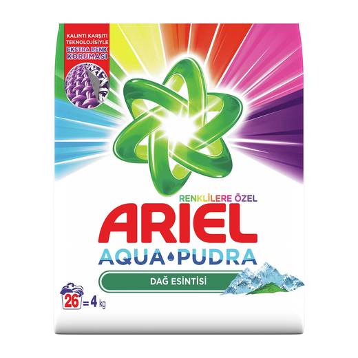 AquaPudra teknolojisine sahip Ariel Dağ Esintisi Renklilere Özel toz çamaşır deterjanı,olağanüstü Ariel temizliği sağlarken renklilerinizin canlılığını korur.Yeni formülü suyla temas ettiğinde çözünür, hızlıca aktifleşir ve hijyen içi derinlemesine temizlik sağlar, giysilerinizi tertemiz yapmak için liflere derinlemesine nüfuz eder.