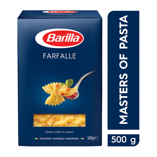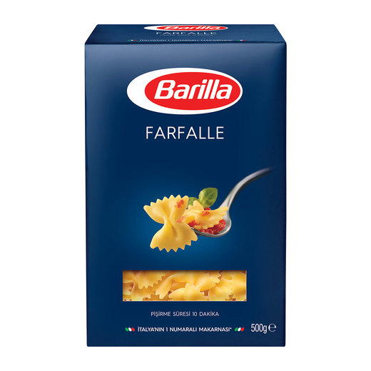 Barilla Farfalle Makarna hem sıcak hem soğuk tüm tarifler için çok lezzetli bir alternatiftir. Barilla Kelebek Makarna 10 dakikada hazırdır.Barilla Farfalle yüksek kaliteli durum buğdayından üretilmiştir.