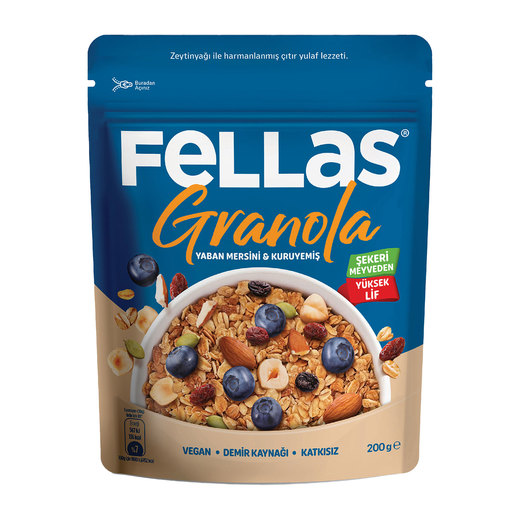 Kahvaltıda ya da ara öğünde, pratik ve lezzetli çözümler bulamama bahanesini Fellas’la yeniyoruz! Yaban mersini, kuruyemişler ve zeytinyağı ile harmanlanmış bu granola, hurma suyu ile tatlandırılmıştır. Katkı maddesi içermez, yüksek lif içeriği sayesinde uzun süre tok kalmanıza yardımcı olur.