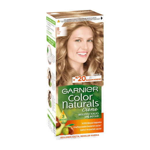 Garnier Color Naturals, formülündeki besleyici yağlar ile saçı derinlemesine besler, pürüzsüzleştirir ve saç yüzeyinde koruyucu bir bariyer oluşturur. Saça derinlemesine nüfuz eder ve rengi saçta hapseder. Uzun süre kalıcı ve parlak renkler. Işıltılı ve ipeksi yumuşaklık. %100 beyaz kapama.