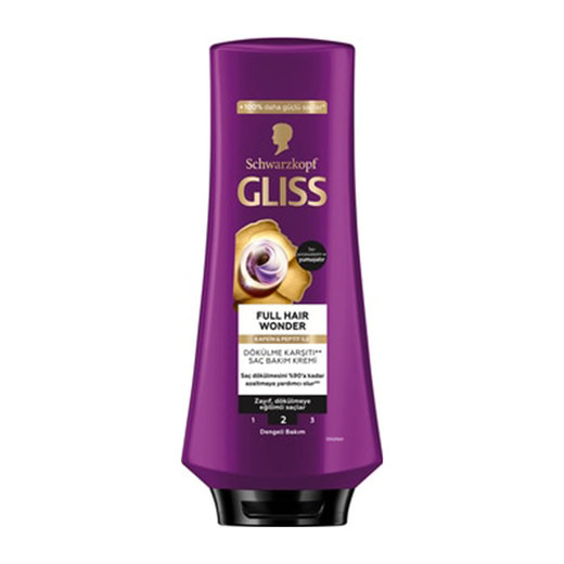 Gliss Full Hair Wonder Dökülme Karşıtı Saç Bakım Kremi, zayıf ve dökülmeye eğilimli saçlar için geliştirilmiş Kafein ve Peptit içeren formülü ile saç dökülmesini %90'a kadar azaltmaya yardımcı olur