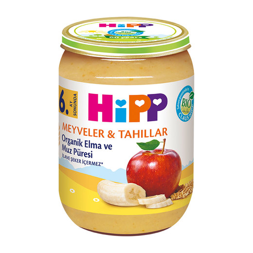 Hipp Organik Elma ve Muz Püresi, doktor kontrolünde ek gıdalara geçiş dönemlerinde bebeğin meyvelerle tanışması için uygundur. 6. ay sonunda tüketilebilir. İlave şeker içermemektedir.