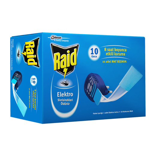 Raid Elektro Mat, odanızdaki sivrisineklerden kurtulmanızı sağlayan ve sivrisineklerin odanıza girmesini engellleyen bir çözümdür.Raid Elektro Mat, tabletleri, yakaşık 8 saat süre ile sivrisineklere karşı etkilidir.