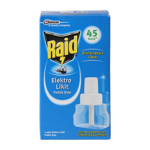 Raid elektro likit, sivrisineklerden korunmada etkili, pratik ve güvenilir bir sistemdir. Kapı veya pencere açıkken, ışık yanarken dahi sivrisineksiz bir ortam yaratır. Raid elektro likit, gecede 8 saatlik kullanımla, sürekli aynı etki ile 45 gece boyunca sivrisineklerden maksimum koruma sağlar.